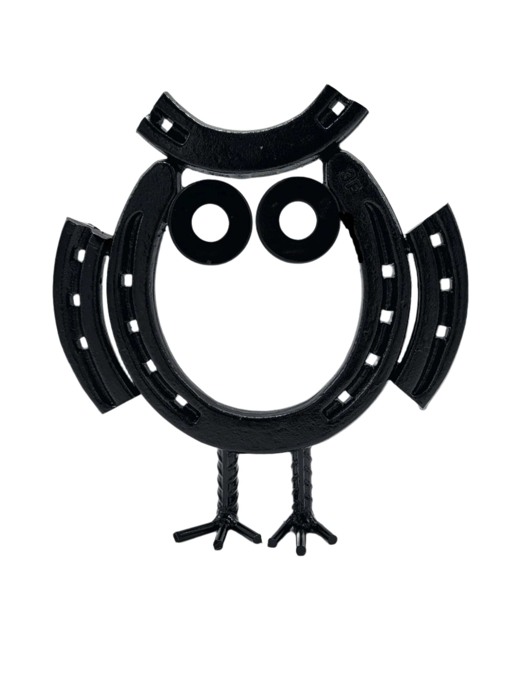 This is a stunning handmade horseshoe owl, expertly crafted from authentic steel horseshoes for a unique rustic touch. This charming owl sculpture blends farmhouse style with artistic flair, making it the perfect statement piece for your home decor or for your desk at work!